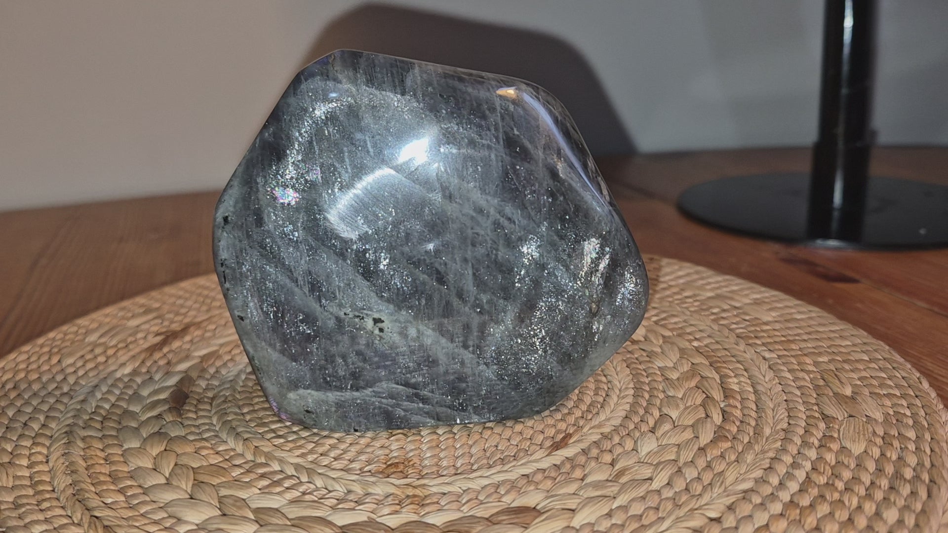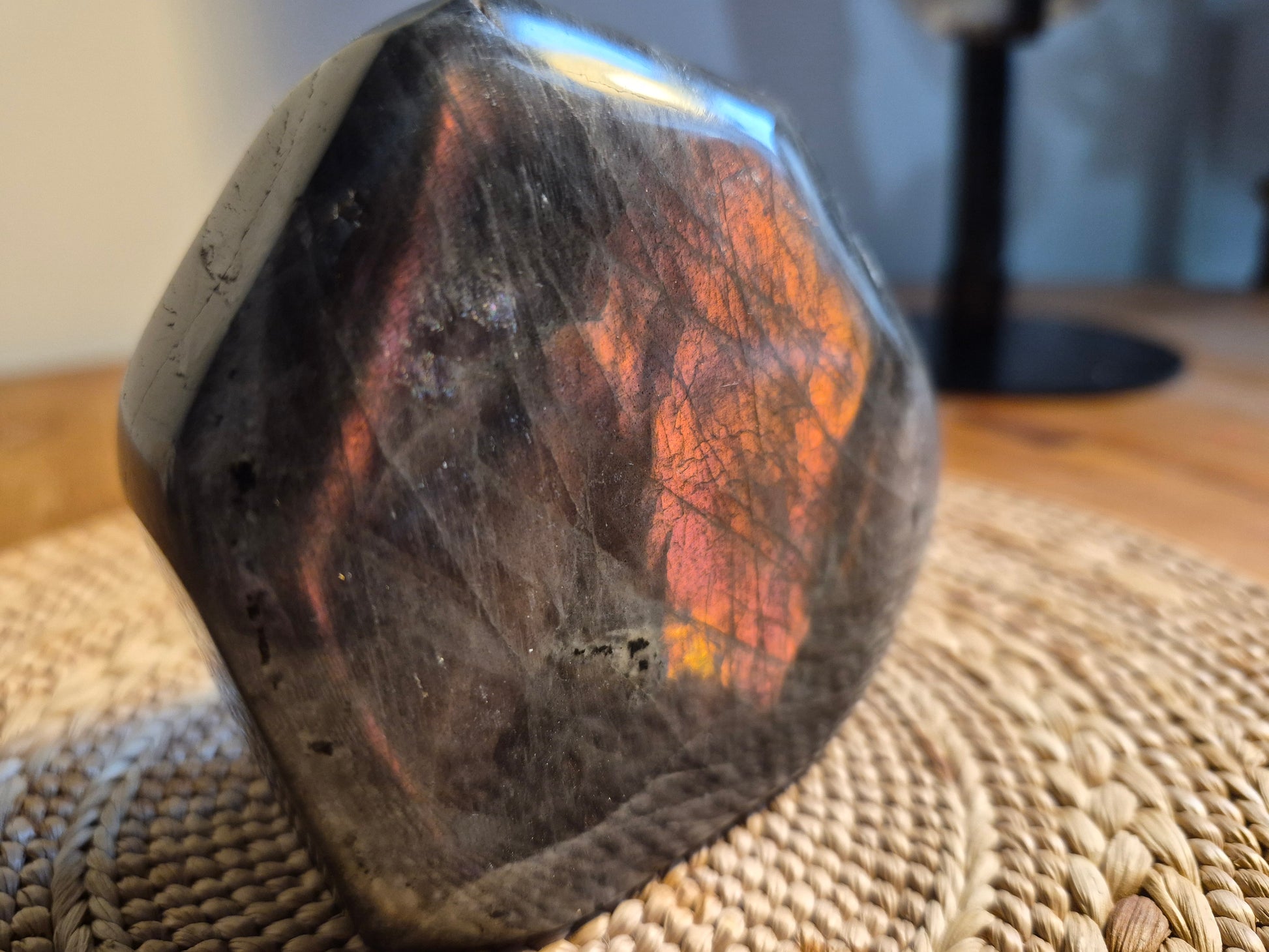 A striking, self-standing Labradorite carved into a modern geometric shape. This piece is unique for its "dual-personality" flash, showing two completely different colors on its polished faces.