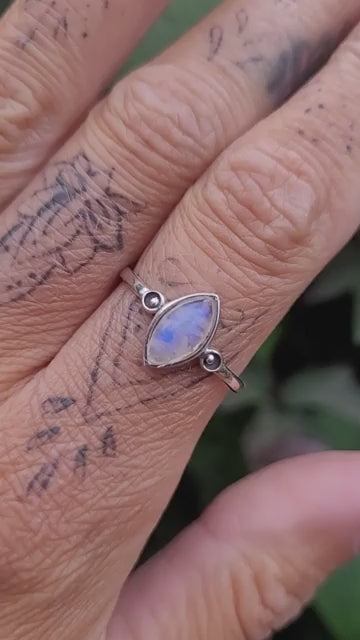 Add a touch of magic to your jewellery collection with this stunning marquise-cut moonstone ring, set in solid sterling silver. The iridescent moonstone shimmers with soft flashes of blue, giving it a mystical, otherworldly glow that changes with the light.