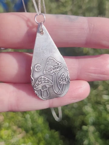 A handcrafted pendant using silver clay with Mushroom details. the silver clay pendant, which is made from recycled silver particles combined with an organic binder to form a clay like material. After being moulded, dried, and refined, the piece is fired to burn off the binder, leaving behind 99.9% pure silver. the pendant is then polished and ready to wear. it has then been treated with a patina, giving them a beautiful blackened finish that highlights the intricate details.